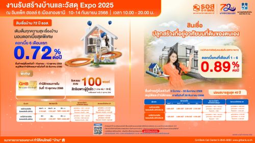 ธอส. กระตุ้นอสังหาริมทรัพย์ส่งท้ายปี จัดสินเชื่อบ้านดอกเบี้ย 0.72% นาน 6 เดือนแรกในงานรับสร้างบ้านและวัสดุ Expo 2025