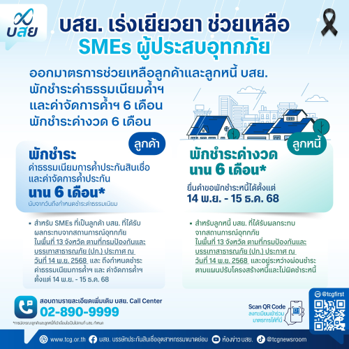 บสย. ออกมาตรการเร่งด่วน เยียวยา SMEs ประสบภัยน้ำท่วม พักชำระค่าธรรมเนียม-ค่างวด ช่วย “ลูกค้า-ลูกหนี้” พลิกฟื้นธุรกิจ