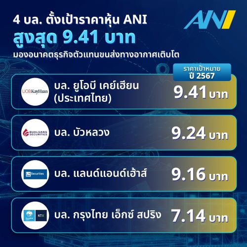 4 บล. ตั้งเป้าราคาหุ้น ANI ปี 67 สูงสุด 9.41 บาท มองอนาคตธุรกิจตัวแทนขนส่งทางอากาศเติบโต