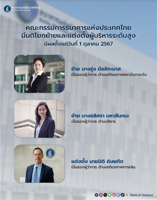 บอร์ดธปท.มีมติโยกย้ายและแต่งตั้งผู้บริหารระดับสูง