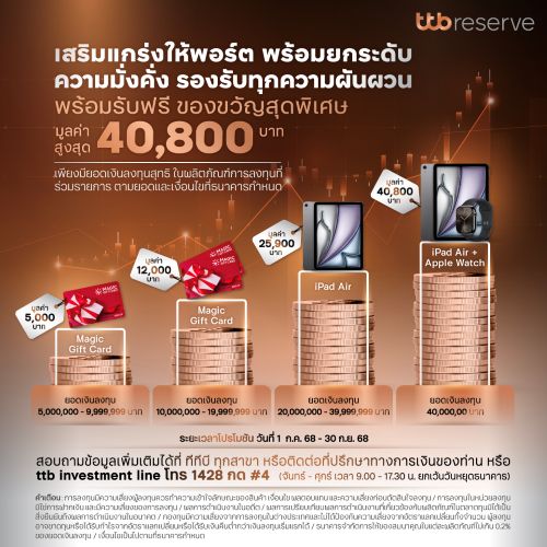 ทีทีบี ชวนลูกค้าต่อยอดความมั่งคั่ง เสริมความแกร่งให้พอร์ตการลงทุนพร้อมรับของขวัญสุดพิเศษ มูลค่าสูงสุด 40,800 บาท
