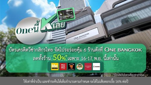 บัตรเครดิตวีซ่ากสิกรไทย ชวนอร่อยคุ้ม ร้านดัง One Bangkok กับโปรแรงลดทั้งร้าน 50%* 16-17 พ.ย.นี้ เท่านั้น