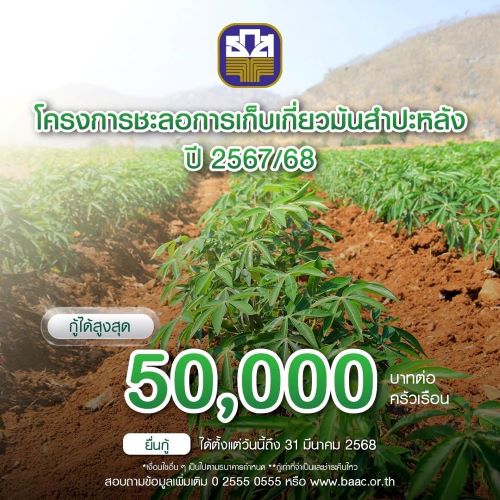 ธ.ก.ส. เดินหน้าโครงการชะลอเก็บเกี่ยวมันสำปะหลัง พร้อมขยายเวลาชำระหนี้ เพิ่มเงินทุนหมุนเวียนช่วยเหลือเกษตรกร