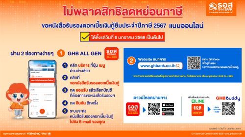 ลูกค้า ธอส. ขอหนังสือรับรองดอกเบี้ยเงินกู้ด้วยตัวเองง่ายๆ ผ่าน 2 ช่องทาง Application : GHB ALL GEN และ www.ghbank.co.th