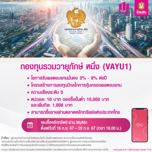 ออมสิน กระตุ้นประชาชนจองซื้อหน่วยลงทุนวายุภักษ์ หนึ่ง ผ่าน MyMo ได้ถึง 20 ก.ย. นี้