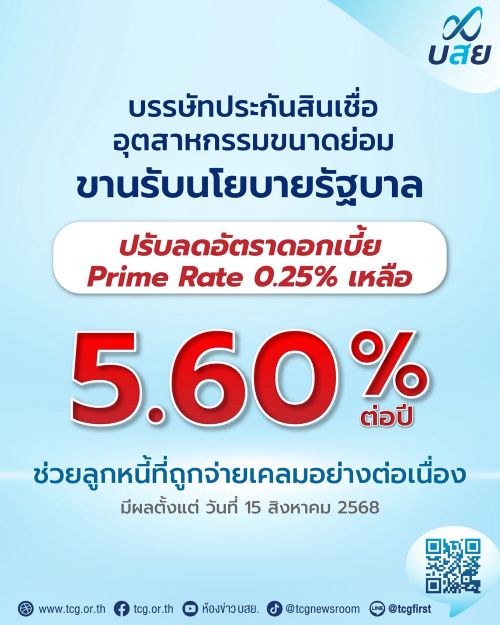 บสย. ประกาศลดดอกเบี้ย Prime Rate ครั้งที่ 3 ของปี เหลือ 5.60% ต่อปี มีผล 15 ส.ค. นี้