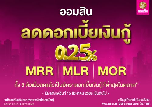 ออมสิน ประกาศลดดอกเบี้ยเงินกู้ทุกตัว 0.25% ทั้ง MRR MLR และ MORมีผล 15 สิงหาคม 68 หวังช่วยกระตุ้นเศรษฐกิจทั้งระบบ