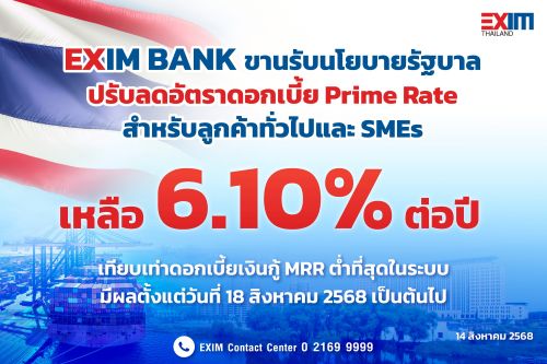 EXIM BANK ยืนหยัดช่วยเหลือผู้ประกอบการด้วยการปรับลดอัตราดอกเบี้ย Prime Rate เหลือ 6.10% ต่อปี ต่ำที่สุดในระบบอย่างต่อเนื่อง