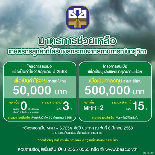 ธ.ก.ส. จัดมาตรการเร่งด่วนช่วยเหลือผู้ประสบอุทกภัยจากพายุโซนร้อนวิภาเลื่อนชำระหนี้ พร้อมวงเงินกู้ฉุกเฉินดอกเบี้ย 0% นาน 6 เดือนแรก