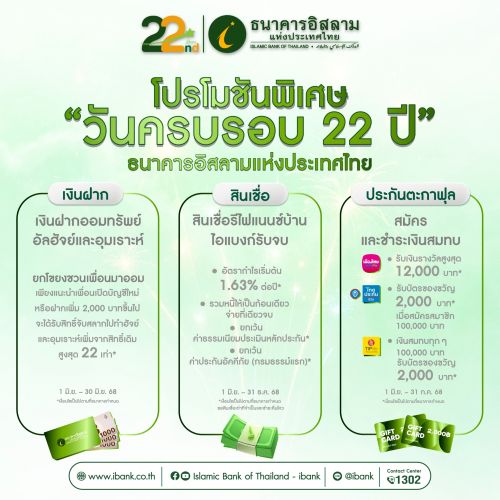 ไอแบงก์ออกโปรดี ฉลองครบรอบ 22 ปี จัดเต็มสิทธิพิเศษเงินฝาก สินเชื่อรีไฟแนนซ์ ประกันตะกาฟุล