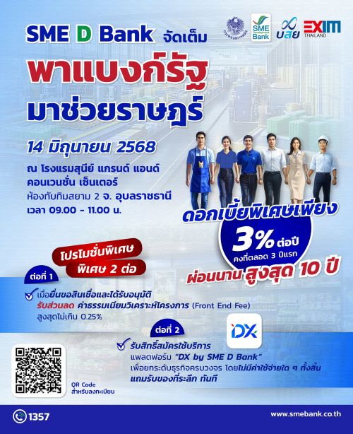SME D Bank จัดใหญ่ในงาน“พาแบงก์รัฐ มาช่วยราษฎร์” จ.อุบลฯ หนุนเข้าถึงสินเชื่อดอกเบี้ยต่ำ แถมรับโปรพิเศษอีก 2 ต่อ