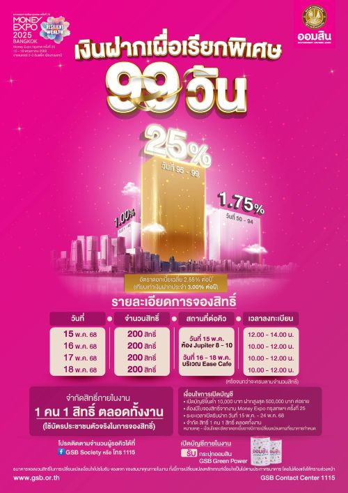 ออมสิน ยกทัพโปรเด็ดเงินฝาก 99 วัน ดอกเบี้ยเฉลี่ย 2.55% ร่วมงาน Money Expo กรุงเทพ 15 – 18 พ.ค. นี้